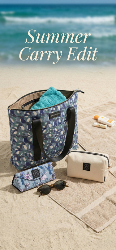 Eternal Circles Beach Tote, Butter Yellow Makyaj Çantası ve Cherry Blossom Gözlük Kılıfı ile plaj stilini tamamla.